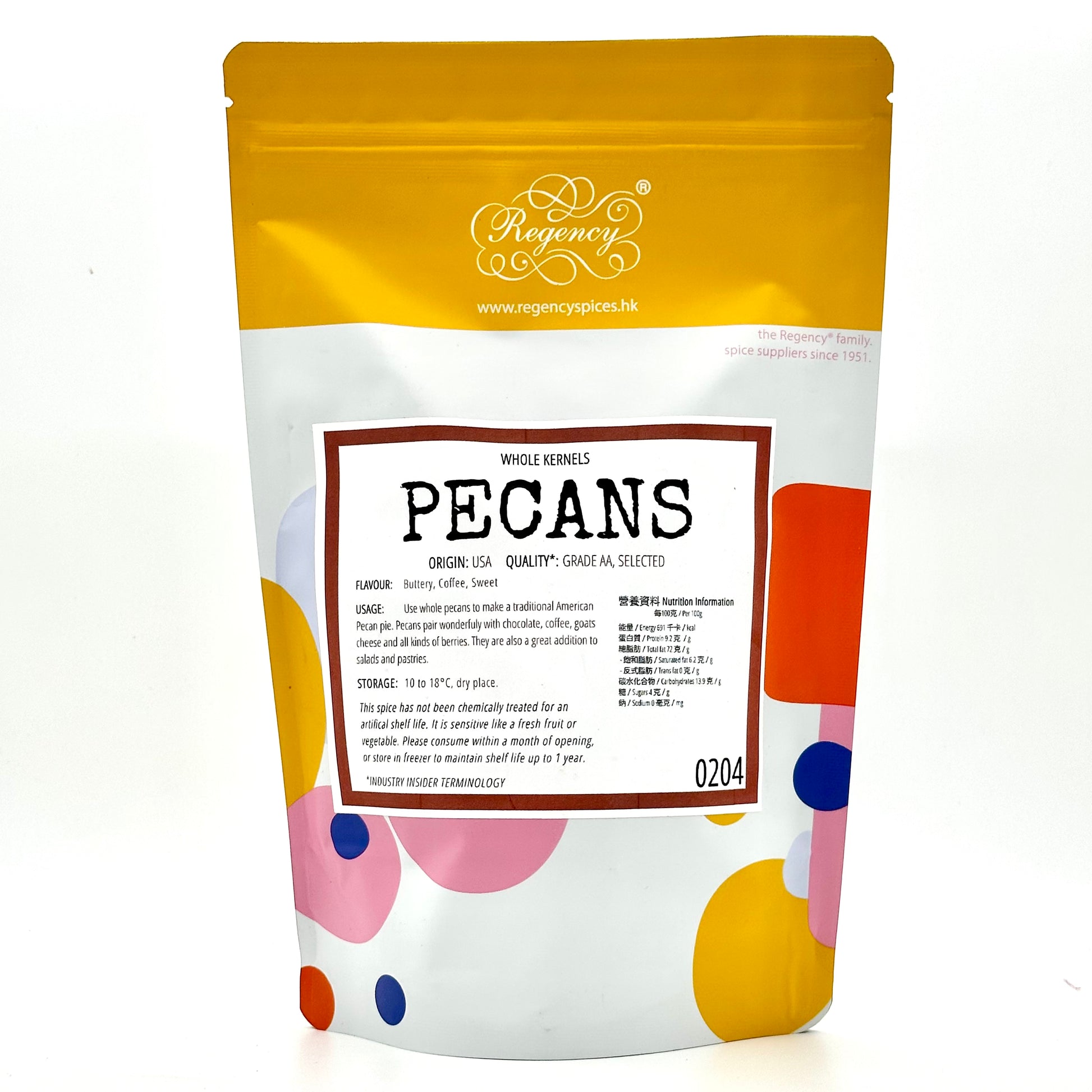 Regency的胡桃來自美國。這些胡桃有非常適合當零食或研磨成糊狀。當然,每個人都對山核桃批(Pecan Pie)最了解,山核桃批是與山核桃來自同一地區的著名南方菜。山核桃也是果仁糖的關鍵成分。胡桃在美國種植,並具有良好的風味和色澤。它們也是純正無鹽的,隨時可以讓您調味。輕輕地烘烤並加入一點糖就可以製成上癮的小吃。