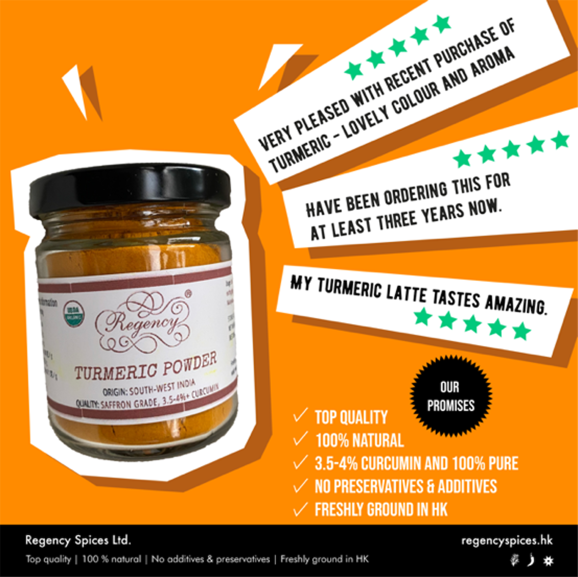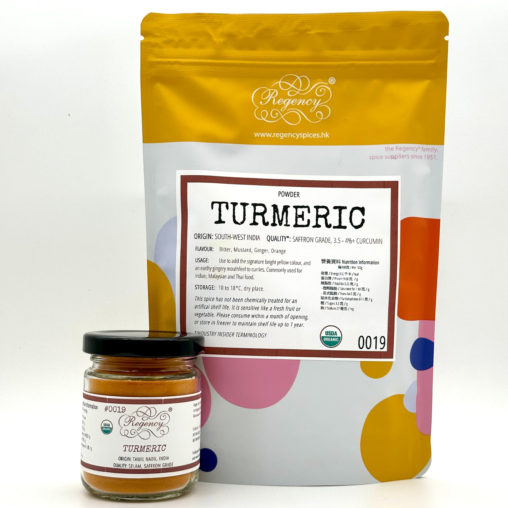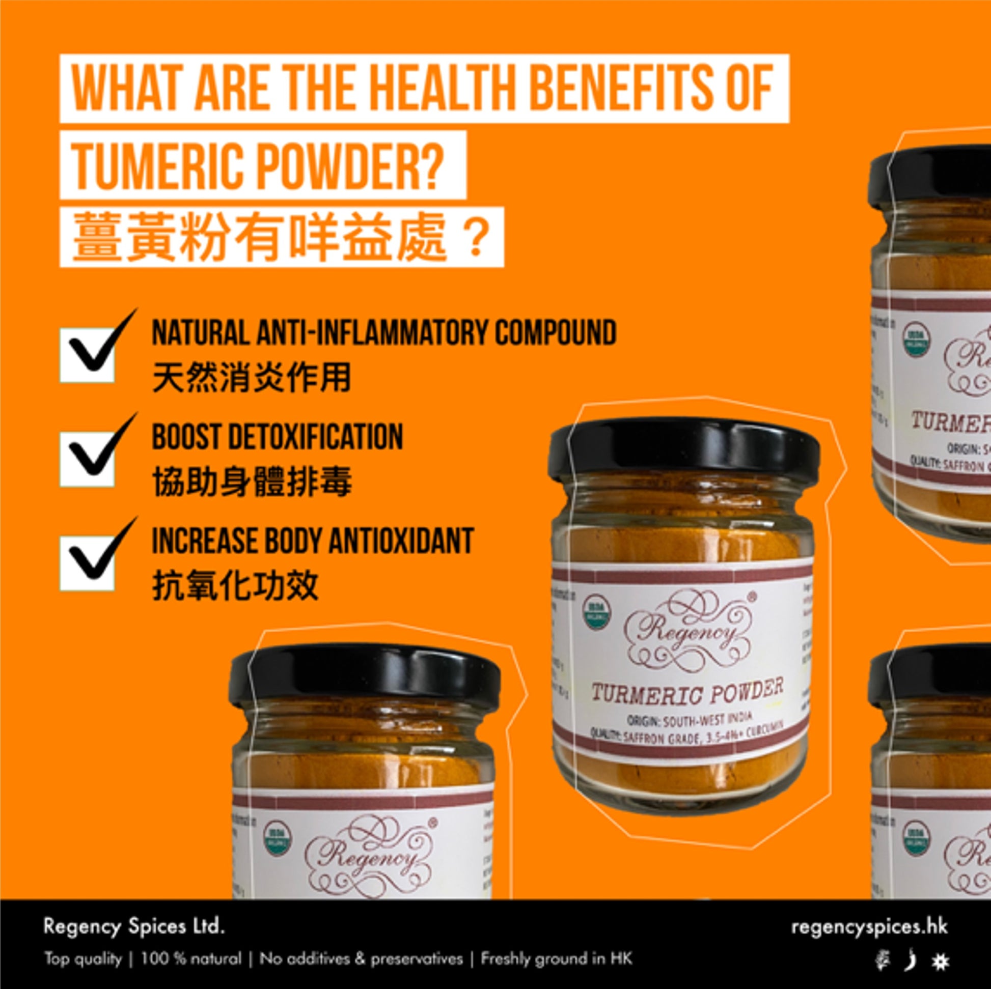 薑黃常常被誤認為是咖哩香料,事實上,雖然它為咖哩提供了許多香味和顏色,但最廣泛的用途是在印度料理中作為天然色素。很多人還對它的藥用功效趨之若騖,其功效在過去十多年被科學界發現並逐漸為人所熟悉。Regency®薑黃的純淨度十分高,只需用上少量已有顯著效果。也叫作「黃薑」。